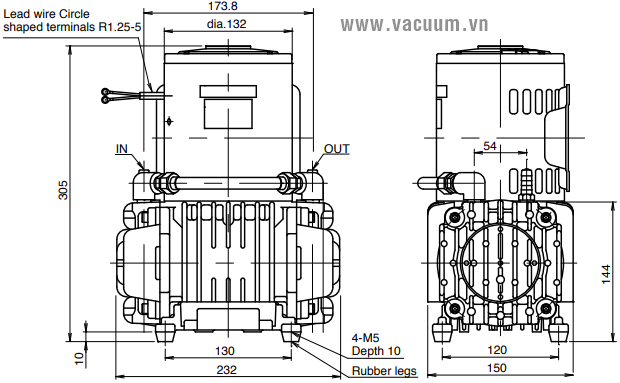 - Kích thước bơm chân không ULVAC DAT-50D: 150(W) × 232(L) × 305(H) mm .