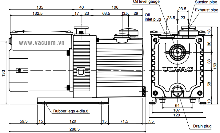 - Quy cách của bơm chân không ULVAC GHD-031B: trọng lượng: 9.3 kg, kích thước bao (dài x rộng x cao): 288.5 x 120 x 163 mm.