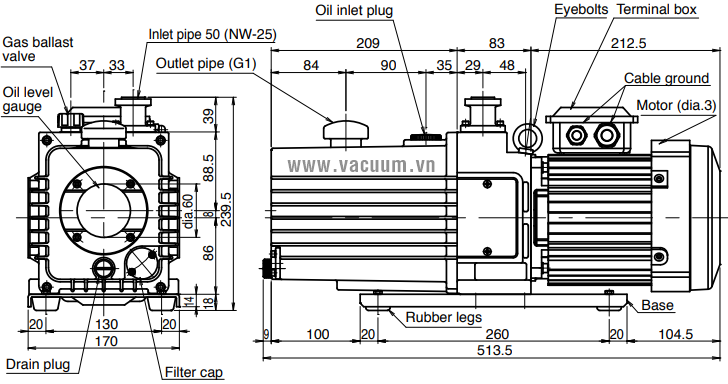 - Quy cách của bơm chân không ULVAC GLD-202AA: trọng lượng: 29 kg, kích thước bao (dài x rộng x cao): 513.5 x 170 x 240 mm.