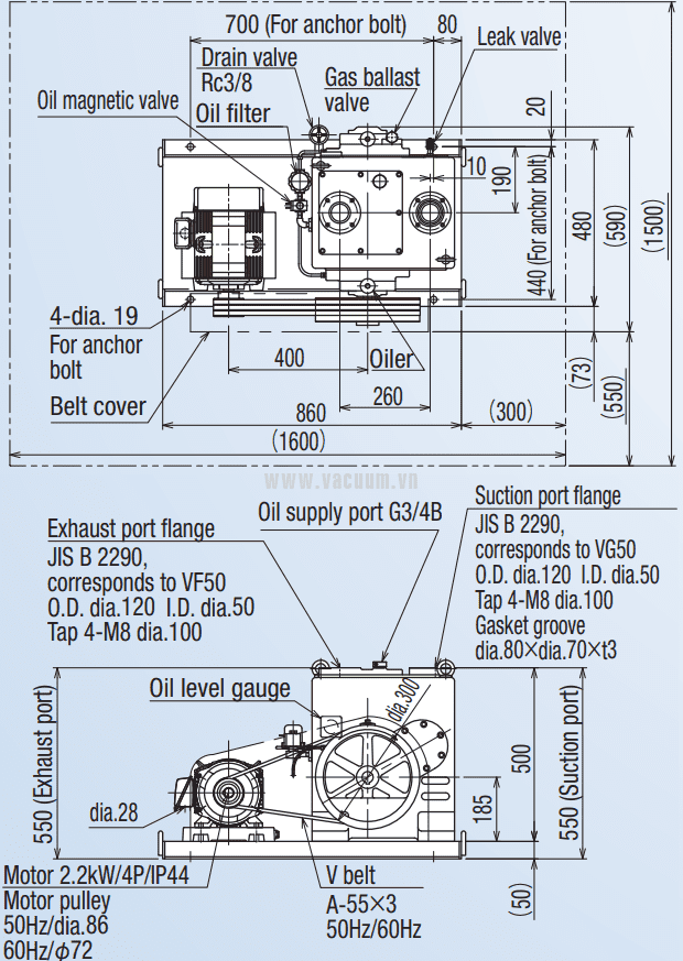 - Size kết nối vào/ra bơm chân không ULVAC PKS-016: VG50 / VF50.