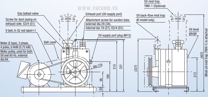 - Bơm chân không ULVAC PVD-360B sử dụng động cơ: 0.75 kW, điện áp 230V/50Hz/1ph hoặc 380V/50Hz/3ph, tốc độ vòng quay động cơ max: 600 vòng/phút .
