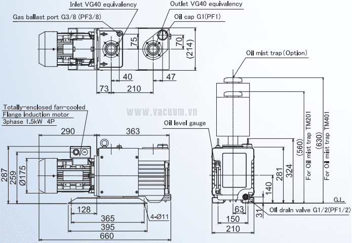 - Quy cách của bơm chân không ULVAC VD30C: trọng lượng: 58 kg, kích thước bao (dài x rộng x cao): 660 x 210 x 324 mm.