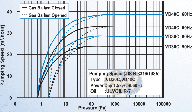 - Bơm chân không ULVAC VD30C, bơm hút chân không ULVAC VD30C, ULVAC Oil Sealed Rotary Vacuum Pumps VD30C thuộc dạng bơm hút chân không vòng dầu (oil-flooded), 2 cấp (dual stage), cỡ trung bình, có lưu lượng: 30 m3/h (500 lít/phút), độ chân không đạt: 6.7x10-3 mbar (khi đóng chấn lưu khí Gas ballast), 2x10-2 mbar (khi mở chấn lưu khí Gas ballast), chuyên dùng để hút chân không trong công nghiệp.