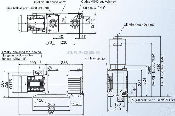 - Để việc vận hành bơm chân không ULVAC VD40C hoàn chỉnh, quý khách lên lắp thêm: áp kế (đồng hồ đo chân không - vacuum gauge) để giám sát độ chân không của bơm. Cũng như lọc gió đầu vào (air inlet filter) để hạn chế bụi, dị vật lọt vào bơm và lọc tách dầu (oil mist filter) đường khí đầu ra, để hạn chế dầu thoát ra ngoài.