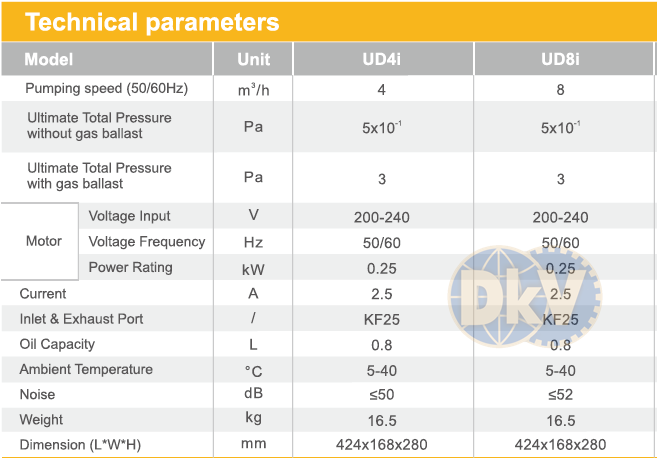- Bơm chân không Value UD4i có độ ồn max: 50 dB(A). Sử dụng động cơ không chổi than (brushless motor): 0.25 kW (1/3HP), điện áp 230V/50Hz/1ph, tiêu chuẩn DIN EN 60034, tốc độ vòng quay động cơ:1.800 vòng/phút.
