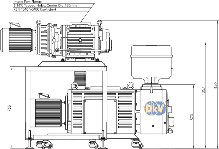 - Bơm chân không tăng áp Bestech MSBM-370D12 có bích kết nối khí đầu vào (đối với bơm tăng áp): VG 100 và bích kết nối khí đầu ra (đối với bơm vòng dầu): VG50.
