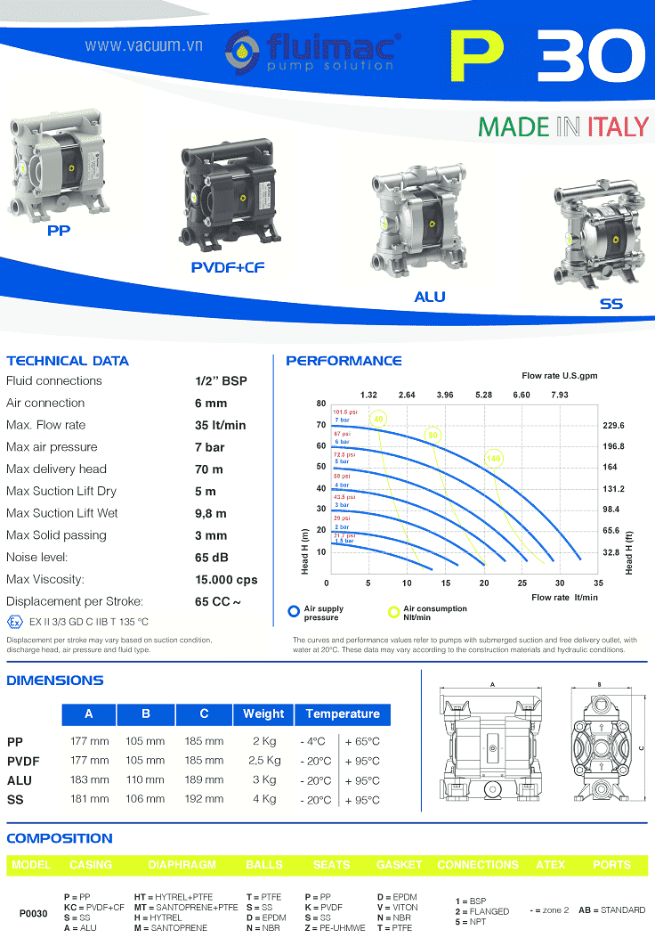 - Bơm màng khí nén Fluimac P0030 (SS), Fluimac diaphragm pump P0030 (SS): thuộc dòng Phoenix P30 của Fluimac/Italy, có thân bơm thép không gỉ SS, màng bơm vật liệu (HT, MT, H và M), lưu lượng tối đa: 35 lít/phút, dị vật rắn qua bơm đường kính < 3 mm, độ nhớt chất lỏng < 15.000 cps.