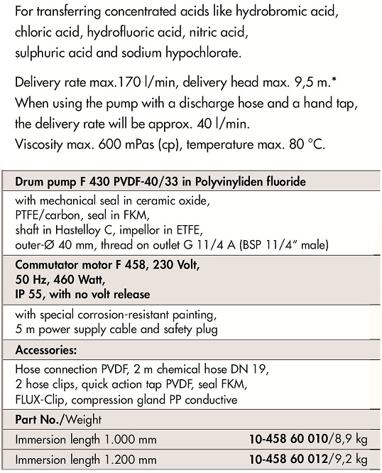 - Bơm thùng phuy Flux F 430 PVDF-40/33, sử dụng động cơ điện FEM 458: 460W/230V/50Hz/1ph, cấp bảo vệ IP 55. Chiều dài dây cắm: 5 m.