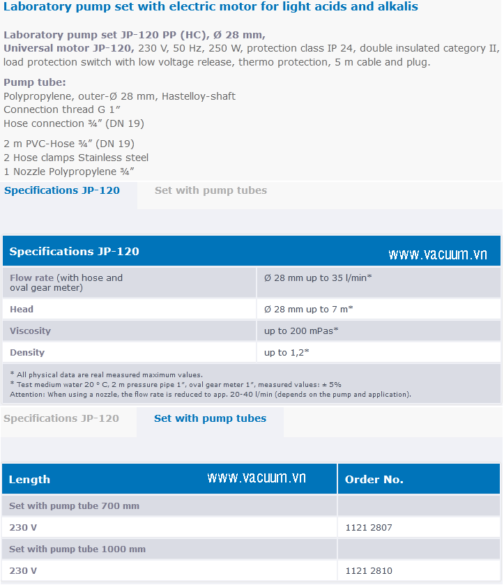 - Bơm thùng phuy Jessberger 1121 2807, sử dụng động cơ JP-120 có công suất 250W, dùng điện 230V/50Hz/1 phase, cấp bảo vệ IP 24, chiều cao cột bơm 700 mm, đường kính cột bơm Ø 28 mm (vật liệu PP), chiều dài vòi bơm 2 mét(vật liệu: PVC), kèm cò bơm.