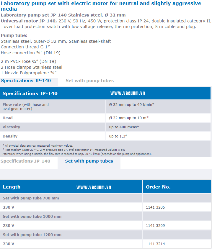 - Bơm thùng phuy Jessberger JP-140 SS (1141 3214) sử dụng động cơ có công suất 450W, dùng điện 230V/50Hz/1 phase, cấp bảo vệ IP 24, chiều cao cột bơm 1.200 mm, đường kính cột bơm Ø 32 mm (vật liệu SS 316), chiều dài vòi bơm 2 mét (PVC), kèm cò bơm.