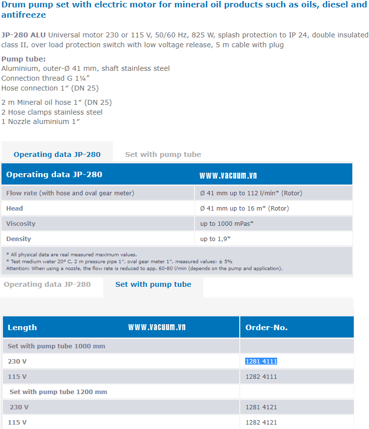 - Bơm thùng phuy Jessberger JP-280 ALU (1281 4111) sử dụng động cơ có công suất 825W, dùng điện 230V/50Hz/1 phase, cấp bảo vệ IP 24, chiều cao cột bơm 1.000 mm, đường kính cột bơm Ø 41 mm (vật liệu aluminium), chiều dài vòi bơm 2 mét, kèm cò bơm.