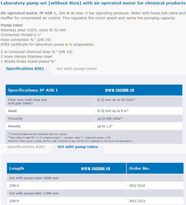 - Bơm thùng phuy Jessberger JP-AIR 1 (3012 3210), sử dụng động cơ khí nén có công suất: 300W, áp khí nén đầu vào: < 6 bar, cột bơm bằng Inox SS 316 cao:1.000 mm, đường kính: Ø 32 mm, ống bơm chịu hóa chất đặc chủng dài 2 mét, kèm cò bơm.
