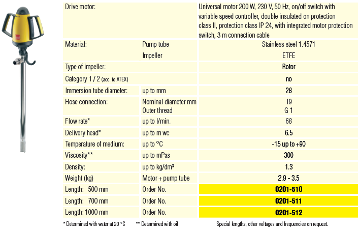 - Vật liệu cột bơm: SS (Stainless Steel), đường kính cột bơm: 28 mm, chiều cao cột bơm: 1.000 mm (đối với mã đặt hàng 0205-032), thích hợp khi bơm các loại phuy công nghiệp tiêu chuẩn