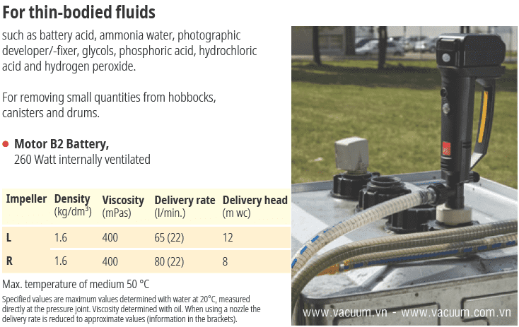 - Bơm thùng phuy Lutz B2 battety, sử dụng động cơ pin: 260W/21.6 V/4 Ah Li-Ionen battery (thời gian hiệu quả của pin chạy liên tục: 34 phút, tương đương bơm 12.6 phuy tiêu chuẩn 200 lít). Phía đầu thân bơm, có núm xoay tăng chỉnh lưu lượng (nhanh/chậm) theo ý muốn. Trang bị sặc pin: 100 - 240 V/50 - 60 Hz/1 ph.