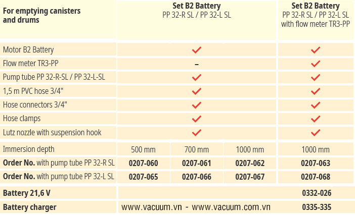- Bơm thùng phuy Lutz B2 battery, Lutz battery drum pump set B2 (Mã đặt hàng: 0207-067) là loại bơm thùng phuy dùng pin, cỡ nhỏ có lưu lượng max: 65 lít/phút, sử dụng để bơm các loại hóa chất, phụ gia, dầu nhờn nồng độ nhẹ trong công nghiệp.