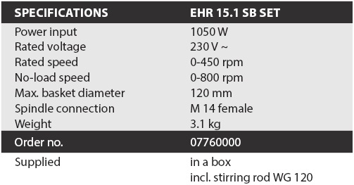 - Máy khuấy trộn Eibenstock EHR 15.1 SB SET, Eibenstock mixer EHR 15.1 SB SET (Code: 07760000) có công suất: 1.050 W, chuyên dùng để khuấy vữa bê tông, sơn, keo, phụ gia, hóa chất.... trong công nghiệp.