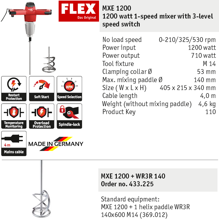 - Máy khuấy trộn Flex MXE 1200 + WR3 140, Flex mixer MXE 1200 + WR3 140 (Code: 433.225) có công suất: 1200/710 W, chuyên dùng để khuấy vữa bê tông, sơn, keo, phụ gia, hóa chất.... trong công nghiệp.